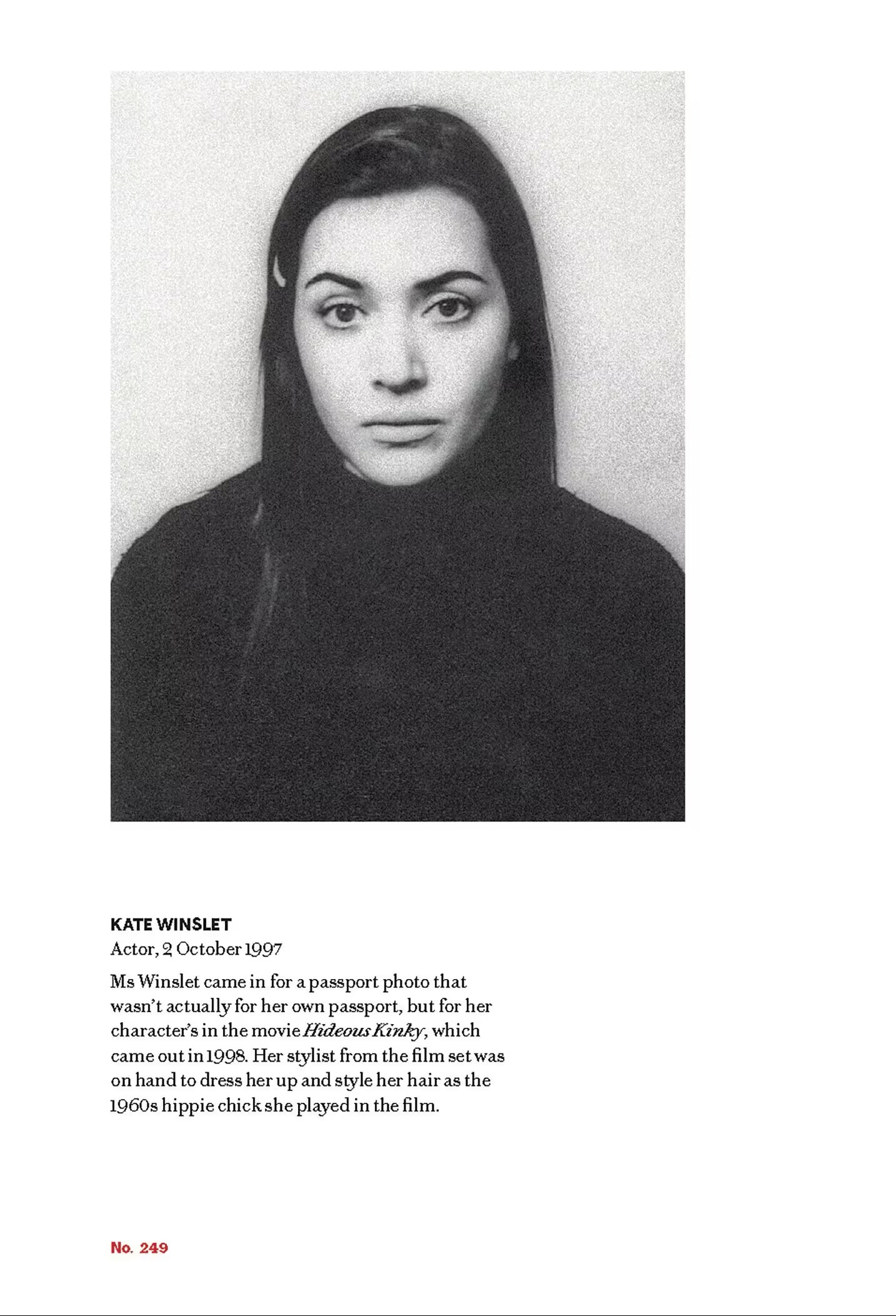 ومن الاستثناءات الممثلة كيت وينسلت، التي حضرت في أواخر التسعينيات مع فريق تصوير أثناء عملها على فيلم “Hideous Kinky”، حيث احتاجت شخصيتها لإظهار جواز سفرها. وقد التُقطت الصورة قبل أشهر قليلة من صدور فيلم “تيتانيك” الذي غيّر مسار حياتها.