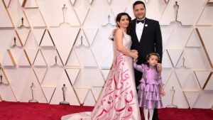 مخرجة الفيلم السوري “من أجل سما” وعد الخطيب، وزوجها وابنتها “سما” على السجادة الحمراء