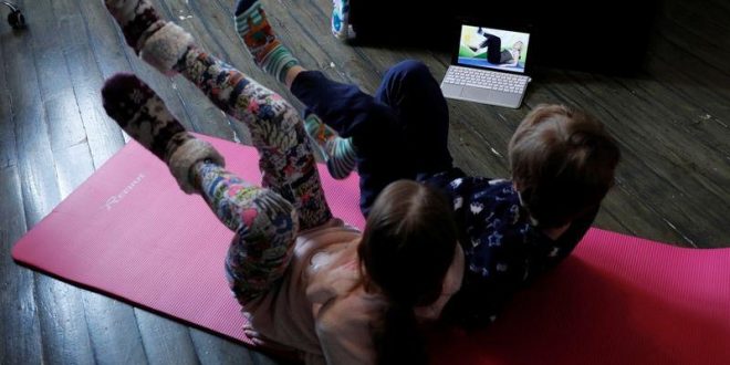 يتشارك الطفل ميخايلو بوندارينكو وشقيقته ماريا حركات اليوجا الأساسية التي يمارسانها في المنزل مسترشدين بتعليمات مدرب على شاشة جهاز كمبيوتر محمول.
