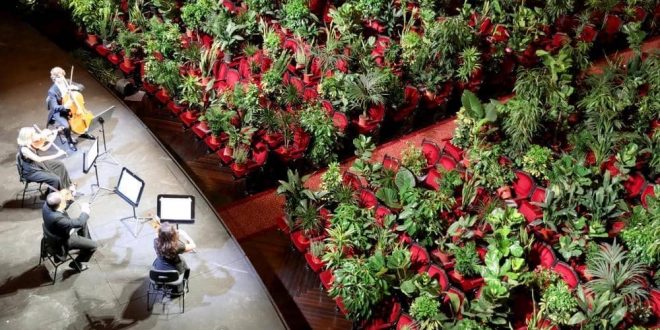 تميزت أولى الحفلات الموسيقية بعد جائحة “كوفيد 19” في مسرح ليسيو الكبير بمدينة برشلونة الإسبانية، بأن عازفي الآلات الوترية الأربعة قدموا عرضهم أمام جمهور، تألف من النباتات وغاب عنه المنظمون من خلال هذه الفكرة أن يلعبوا على وتر “علاقة الإنسان بالطبيعة”، التي استعادت حقوقها في مرحلة الحجر المنزلي.