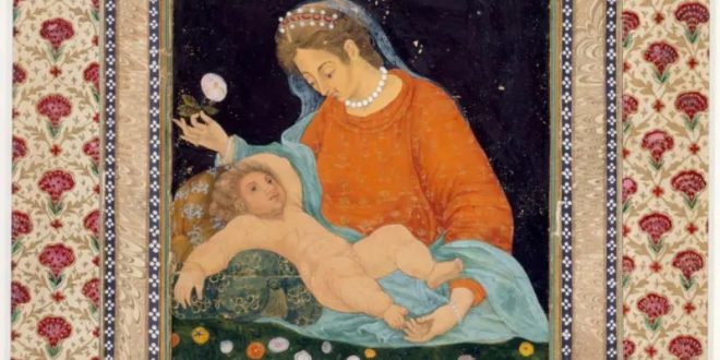 ويعود الفضل إلى الإمبراطور المغولي، محمد جلال الدين أكبر، في إدخال المسيحية إلى شمال الهند من خلال دعوة المبشرين اليسوعيين لزيارة بلاطه. وأدخل المبشرون إلى الهند الكتب المقدسة والأعمال الفنية الأوروبية التي تتناول موضوعات مسيحية كان لها عظيم الأثر على رسامي البلاط الملكي. كما كلف الإمبراطور أكبر وخلفاؤه العديد من الفنانين برسم لوحات جدارية تتناول موضوعات مسيحية، وبدأ بعض رسامي البلاط في تطعيم لوحاتهم المسيحية بعناصر من الفن الإسلامي في هذه الجداريات. وتحدثت نيهة فيرماني، المؤرخة المتخصصة في منطقة جنوب آسيا، عن لوحة رسمها فنانون في بلاط المغول تصور الإمبراطور جهانغير في مشهد المهد، والذي يصور مريم ويوسف والطفل يسوع.