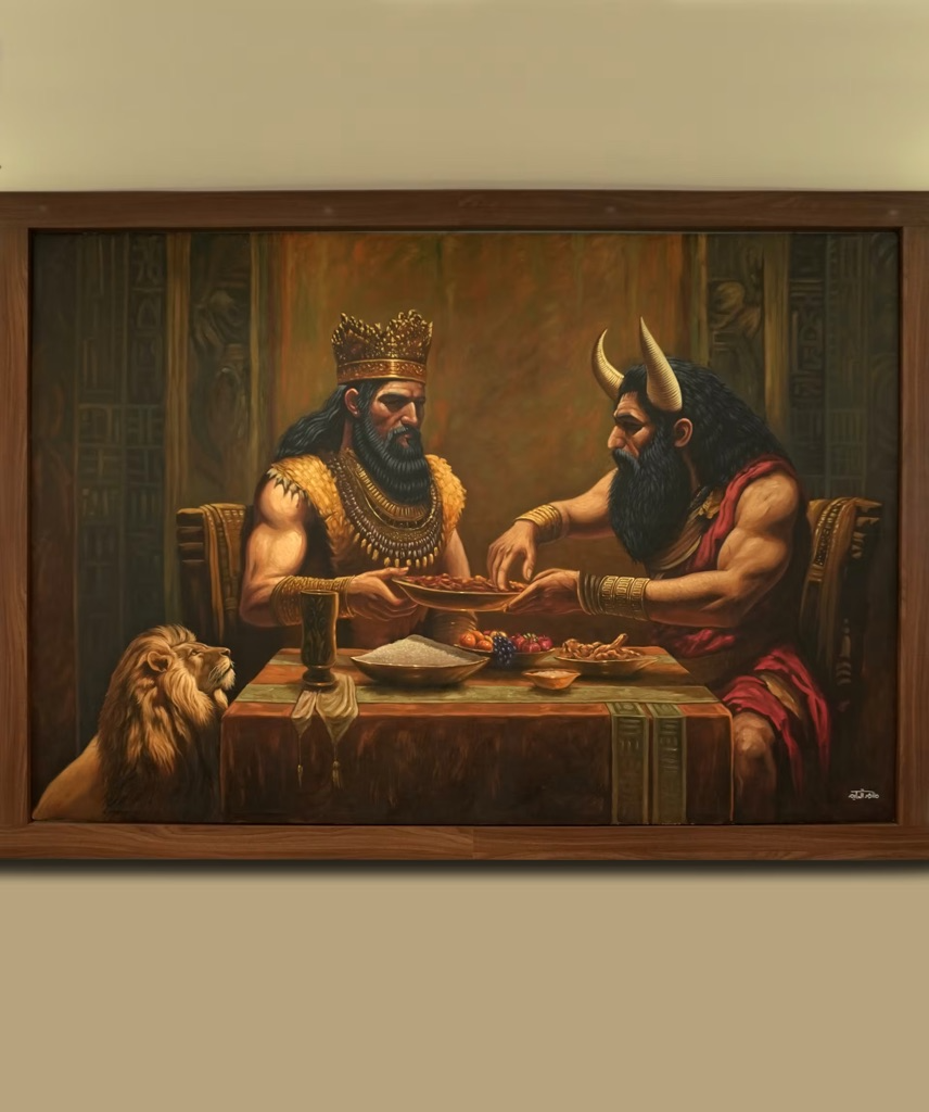 اكبر لوحة زيتية لملحمة “جلجامش” بتوقيع الفنان العراقي منتظر الحكيم.